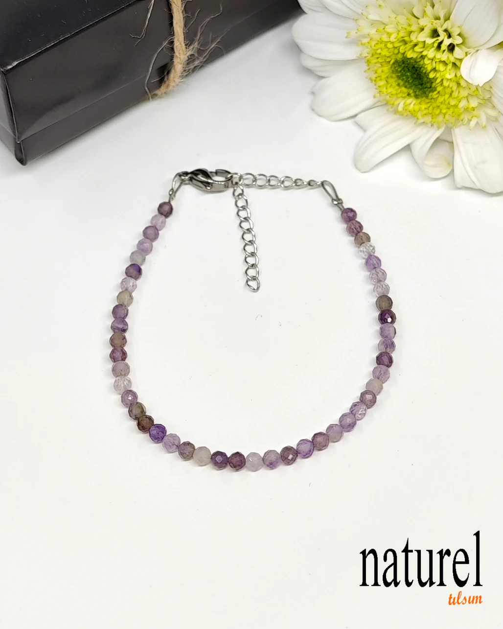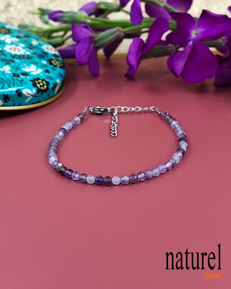 Ametist 3mm Fasetli Doğal Taş Bileklik | Mor tonlarıyla büyülediği kadar, enerjisiyle de ruhu besleyen ametist, yüzyıllardır şifa ve huzur taşı olarak kabul edilir. 6mm ametist doğal taş bilekliğimiz, bu özel taşın tüm iyileştirici gücünü size sunar. Ametist, üçüncü göz çakrası ile güçlü bir bağlantıya sahiptir. Bu çakra, sezgi, iç görü ve ruhsal farkındalık ile ilgili olduğu için ametist bu özellikleri güçlendirir. Kendinize veya sevdiklerinize huzur dolu bir hediye olabilir. Bu bileklik, ametist doğal taşından yapılmıştır. Ametist, stresi azaltmaya, uyku düzenini iyileşti Devamını Göster
