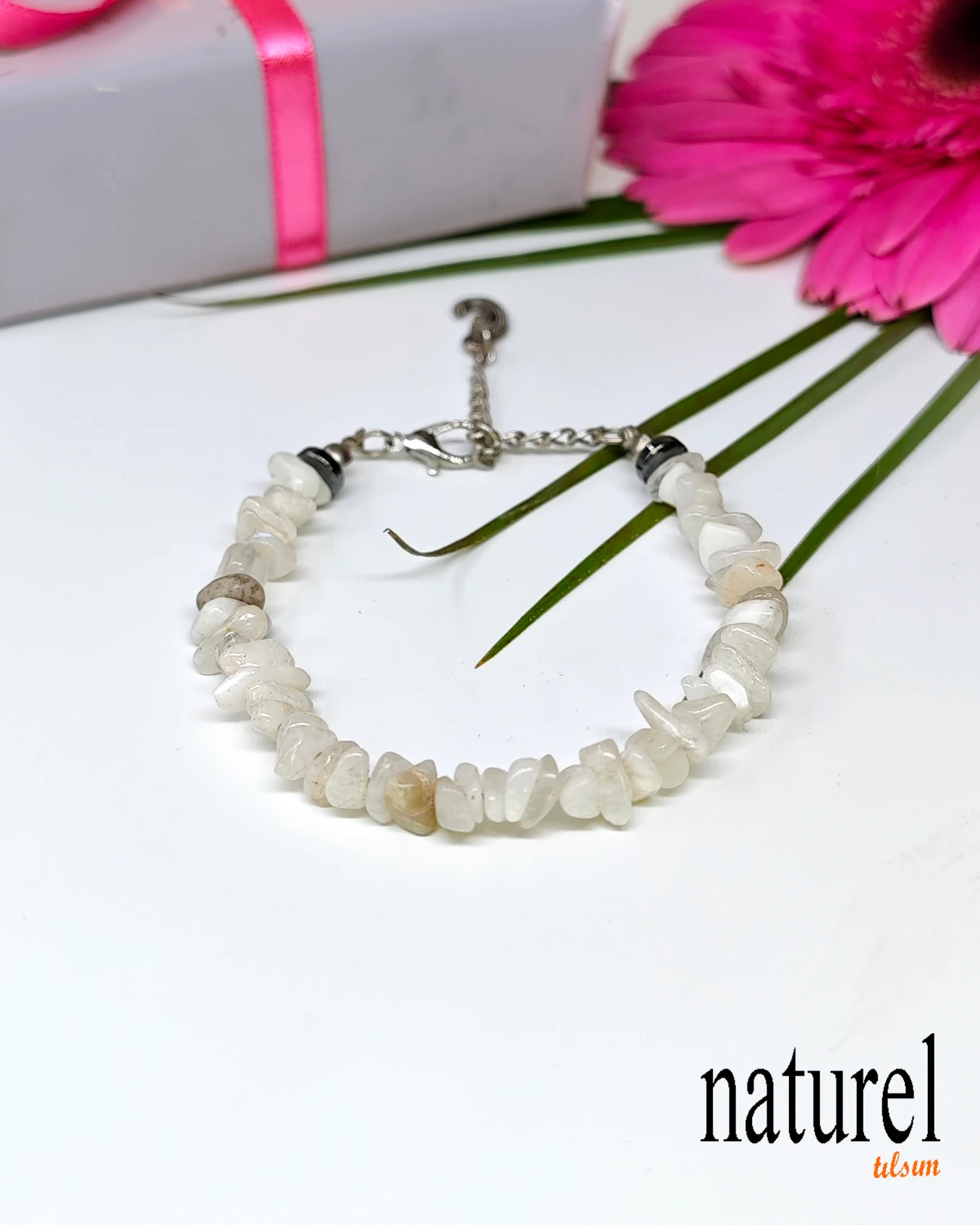 Ay Taşı Kırık Doğal Taş Lady Bileklik | Ayın mistik güzelliğini ve enerjisini taşıyan ay taşı, duygusal dengeyi sağlayan ve içsel huzuru artıran güçlü bir kristaldir. Ay taşı, genellikle beyaz, mavi veya gri renklerde bulunan ve inci gibi sedefimsi bir görünüme sahip olan bir doğal taştır. Ayın enerjisiyle bağlantılı olduğu düşünülen bu taş, duygusal dengeyi sağlamada, sezgiyi güçlendirmede ve uykuyu düzenlemede etkilidir. Ay taşı, duygusal iniş çıkışları azaltır ve iç huzur sağlar. İç sesinizi dinlemenizi ve sezginizi geliştirmenizi sağlar. Daha derin ve dinlendirici bir uyku çekmenize yardımcı olur. Kadınların hormonal dengesini destekler. Sevgi ve şefkat enerjisini artırır.